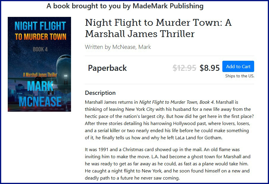 Marshall James returns in Night Flight to Murder Town, Book 4 in the series. He’s thinking about leaving New York City with his husband for a quieter life, away from the relentless pace of the nation’s largest city. But how did he get here in the first place?