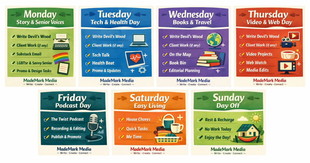 If I didn’t love doing all this, I wouldn’t. But it fuels me. It also gives me a personal world that is a refuge from the spiraling madness of the greater world around me. If creativity is an escape, I’ll gladly pursue it. And a weekly schedule is at least a foundation, even if I veer off it pretty much every day.